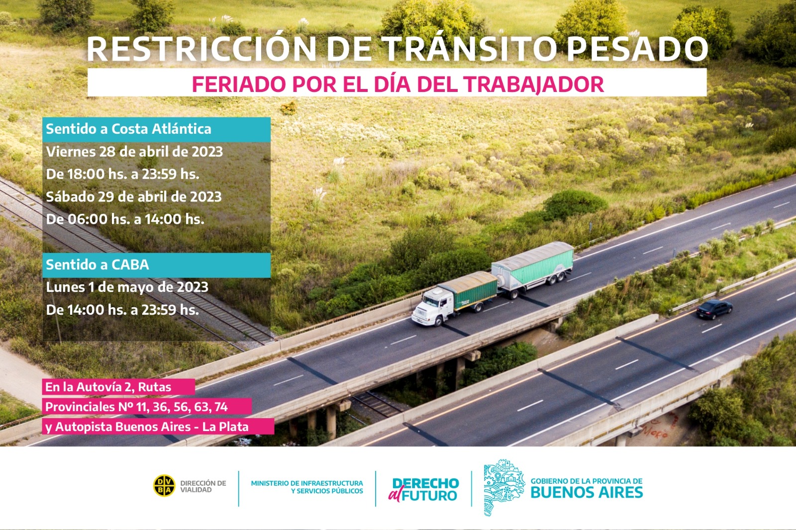 La Dirección de Vialidad de la Provincia de Buenos Aires, dependiente del Ministerio de Infraestructura y Servicios Públicos, comunica que debido al feriado por el Día del Trabajador, el viernes 28 y sábado 29 de abril como así también el lunes 1 de mayo, se restringirá la circulación de camiones con carga de más de […]